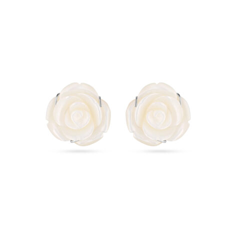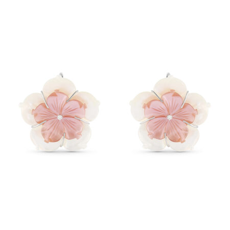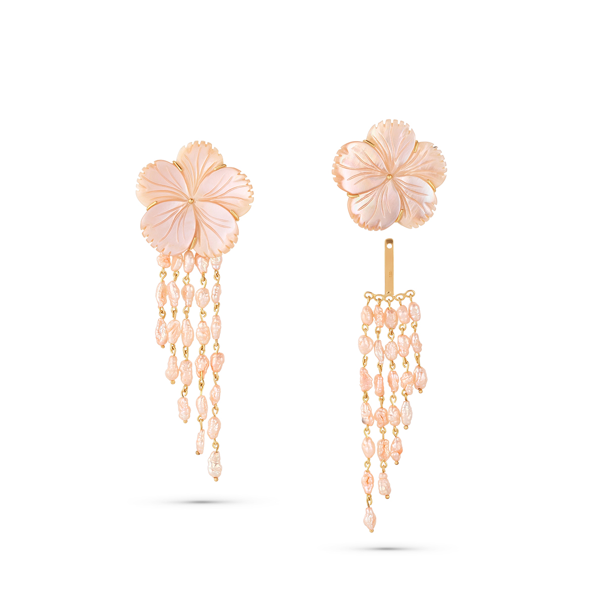 Blossom Pink Flower earrings with a removable chandelier rice pearls design. Centered gracefully on the ear for an elegant look. Celebrating Damascus heritage with a modern refinement, turning every gesture into a delicate statement of timeless elegance.