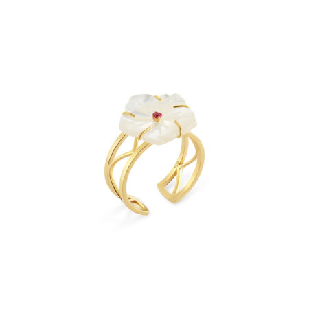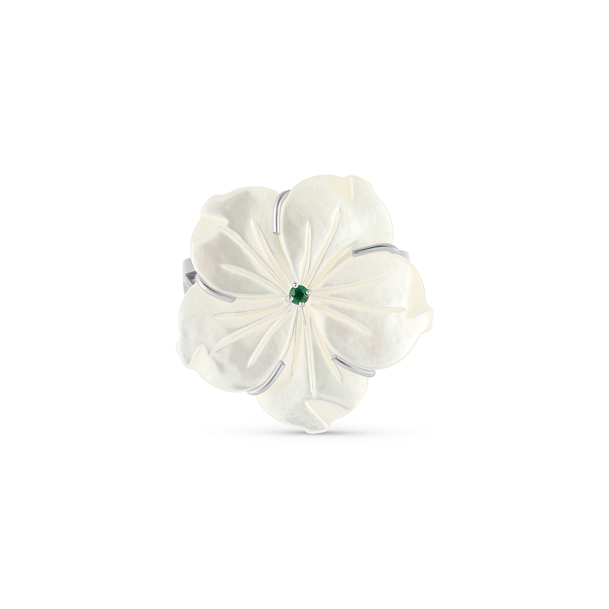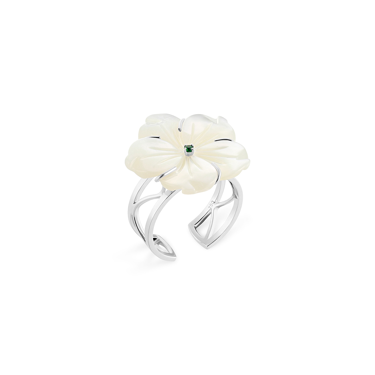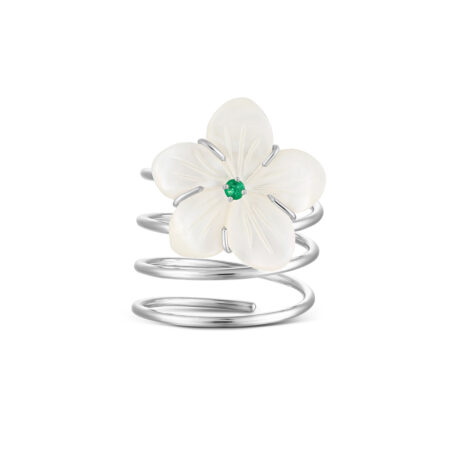 The Star Emerald Open Ring is a refreshing interpretation of the Damascene jasmine, where the purity of the Star Jaz meets the deep, regality of the emerald. Set in cool 18k white gold, this piece evokes the image of a jasmine flower blooming in a shaded courtyard, its center glowing with the lush green of a hidden oasis.